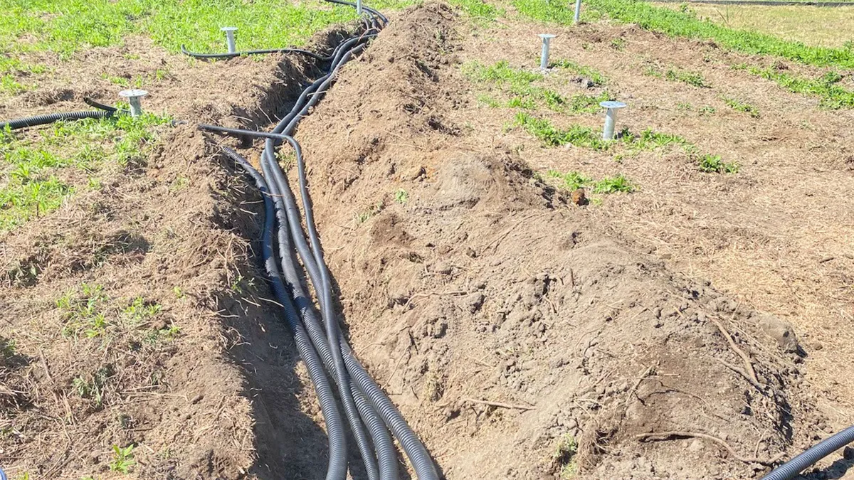 太陽光パネルからパワーコンディショナーへ、発電した電気を送るための配管を埋設します。