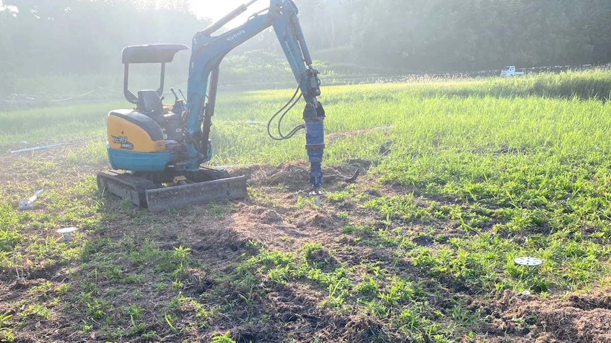 重機による整地工事、造成工事、基礎工事が終わったら、杭打ちを行なって行きます。